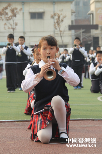 沁阳市实验小学学生表演千人唢呐演奏,欢迎台湾师生代表参访。图为演奏唢呐的沁阳市实验小学学生。(中国台湾网 扶海涛 摄)