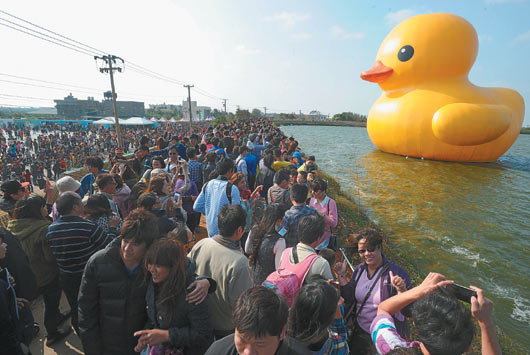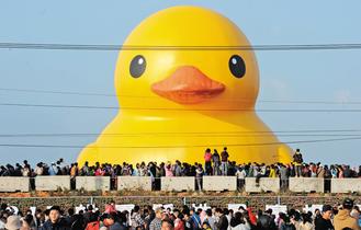 中国台湾网10月27日消息 据台湾《联合报》报道,大黄鸭昨天到桃园亮相,吸引12万人次。不仅摊贩抢进,沿途民宅、店家也摇身一变,成了计次收费临时停车场,人人抢发小鸭财。