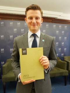 英国智库29日公布2013全球繁荣指数报告,台湾总排名第22,较去年下跌2名。图为负责繁荣指数调查主任甘斯特和报告。(台媒图)