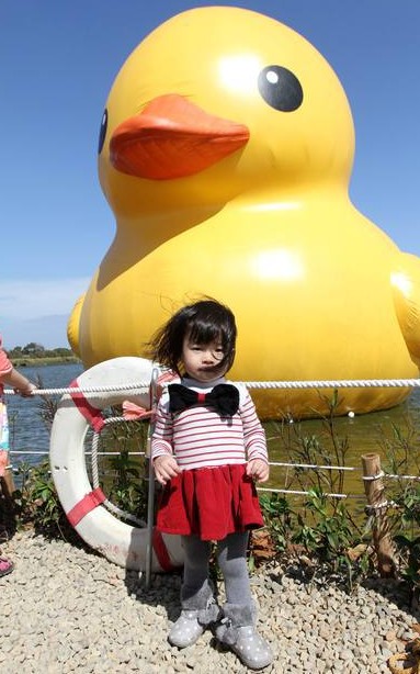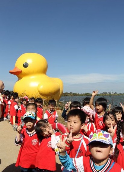 从新竹来的幼儿园小朋友在小鸭前欢呼。(台媒图)