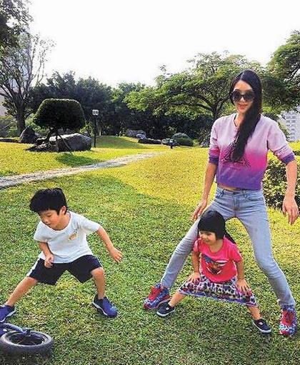 曹格的妻子吴速玲(右)昨带着儿女在中部亲戚家附近踏青散心。(台媒图)