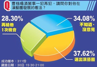 台媒昨针对“曹格喝酒闹事一犯再犯,请问你对他在演艺圈发展的看法?”进行民调,311份样本中,37.62%民众认为他应退出演艺圈,28.3%民众认为应再给他1次机会,34.08%民众则表示不知道、没意见。(中国台湾网 高旭)