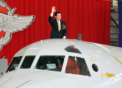 接机典礼之后,马英九登上机舱听取性能介绍,并在机舱内和与会者挥手致意,竖起大拇指比赞。