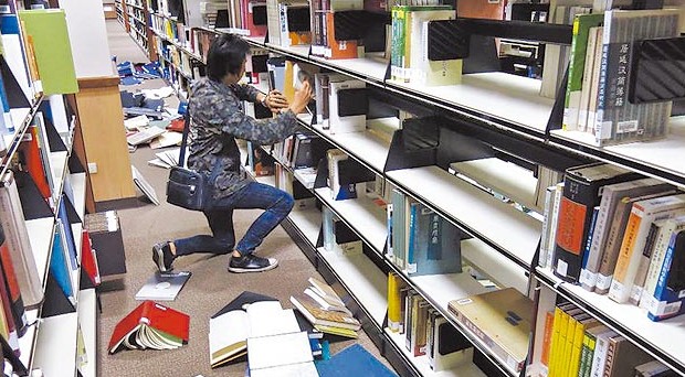 位于花莲的东华大学图书馆藏书掉落满地,校方漏夜整理。(台媒图)