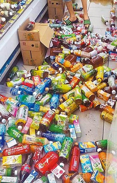 昨地震发生后,花莲凤林镇超市内的饮料掉满地。(台媒图)
