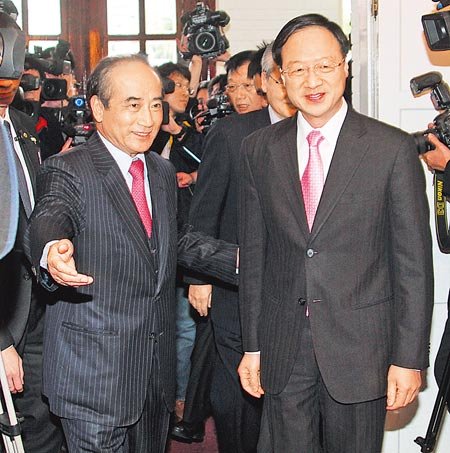 江宜桦(右)今年2月19日上任“行政院长”当天,即拜会“立法院长”王金平,表示未来许多重大法令通关都仰赖他的支持。但9月以来,由于王金平涉入司法关说个案,马英九、江宜桦与王金平的关系一度陷入僵局。外界解读认为,马、江发动“政争”的原因之一是,王在相关法令通关上未予执政党全力支持。(来源:台湾《中国时报》)