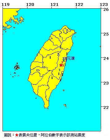 地震示意图。图中红五角心表示震中位置,数字表示震度规模。(图片取自台媒)