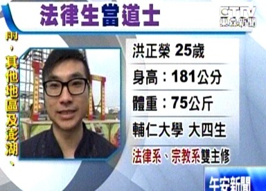 大四学生洪正荣因为热爱宗教,回乡参加成功登刀梯、下钉梯,晋升为正式道士。他年仅25岁,就读辅仁大学,由于兴趣选读法律系和宗教系双主修,未来还想当一名人权律师。洪正荣说:“希望藉由神的力量以及未来的法律专业,希望带给这个社会更大的帮助。”他说邻居伯公就是道士,从小到大耳濡目染,大三时就决定将对台湾的宗教文化热情化为行动,现在付诸实行梦想成真。(中国台湾网 高旭)
