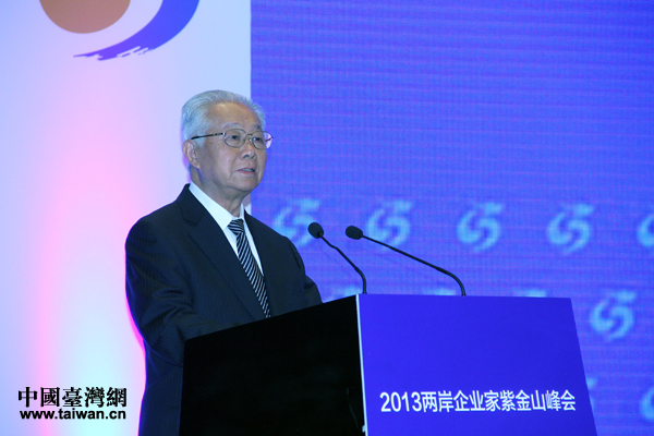 两岸企业家峰会台湾方面副理事会长江丙坤在闭幕式上作总结发言。(中国台湾网 王伟 摄)