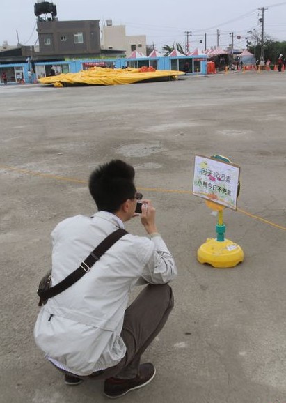 民众蹲在地上拍扁鸭和告示牌。(台媒图)