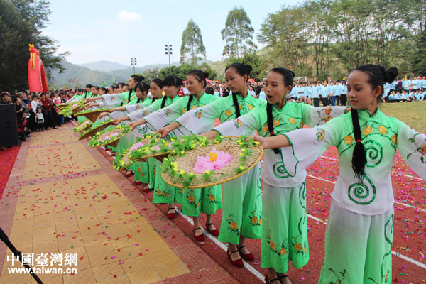 古竹顶新中学学生在剪彩仪式后表演客家舞蹈“请到客家土楼来做客”(中国台湾网 芜同 摄)