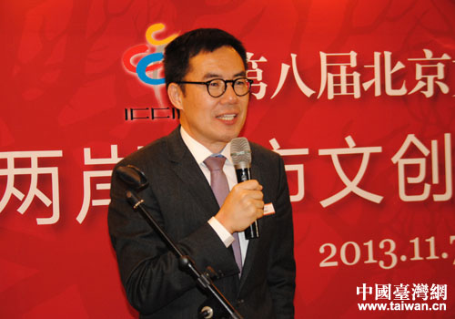 台湾文创参访团团长、台北市文化局长刘维公在第八届北京文博会两岸城市文创交流酒会上致辞。(中国台湾网北京通讯员 郭宁 摄)
