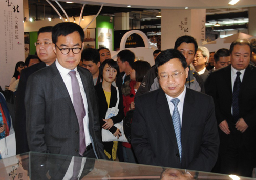 11月7日上午,国台办交流局长程金中(前右)在台北市文化局长刘维公(前左)陪下参观第八届文博会台湾文创精品馆。(北京市通讯员 郭宁 摄)
