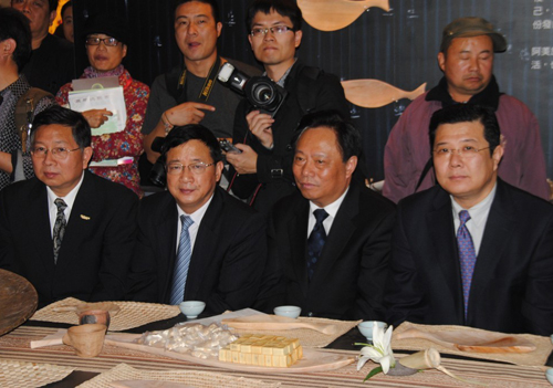 11月7日上午,第八届文博会台湾文创精品馆举办台湾少数民族“部落行销”开幕式。全国台联党组书记梁国扬(右二)、国台办交流局长程金中(左二)、北京市台办主任汪明浩(右一)和台旅会办事处主任杨瑞宗(左一)出席。(北京市通讯员 郭宁 摄)