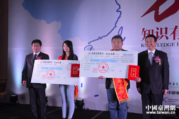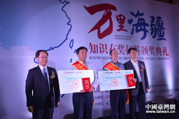万里海疆知识有奖征答台湾首奖施羽芹(左二)与大陆首奖吴晓(右二、代领)分获十万元新台币现金大奖(两万元人民币)(摄影 郑霁远)