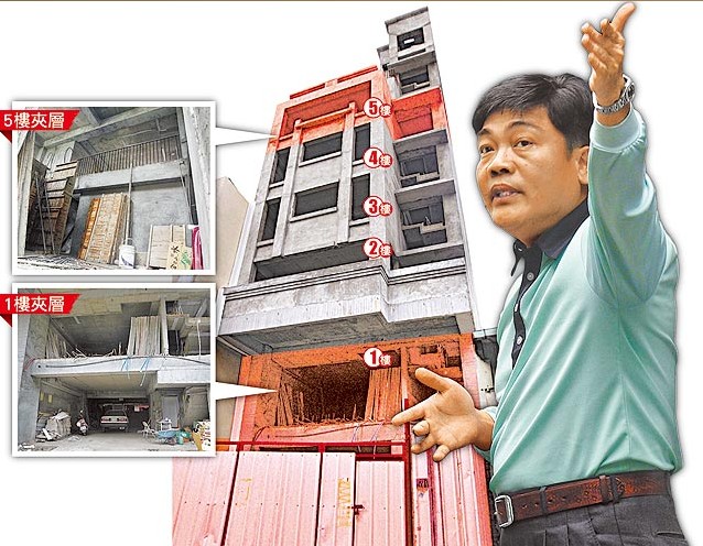 书记官杨金池与妻子申请兴建5层独立住宅,却在1楼与5楼盖非法夹层(白框处),让5楼变7楼。(台媒图)