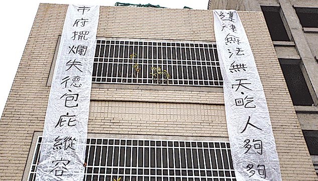邻居在住家外墙挂布条抗议市府包庇纵容。(台媒图)