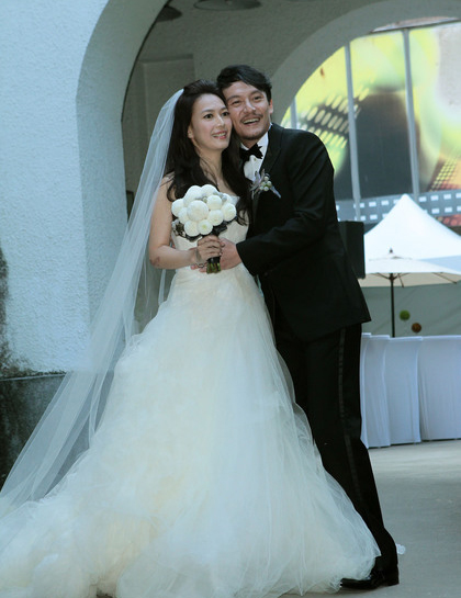 张震(右)今日完婚,新娘庄雯如穿着白婚纱亮相。(图片来自台媒)
