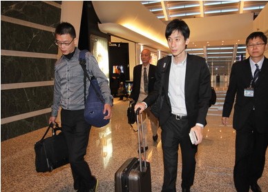 张安薇的哥哥(后)与许立民的二哥(左)准备前往登机。(台媒图)
