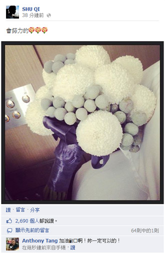 昨晚舒淇步出婚礼派对时,脸上带着甜蜜笑意说“很开心,看到好朋友嫁出去很开心”,言语透露出舒淇与张震太太庄雯如也是好朋友。舒淇今早还在facebook上晒出捧花照片,并直喊“会努力的”,获得不少网友按赞,回应她说“幸福在妳身边”。