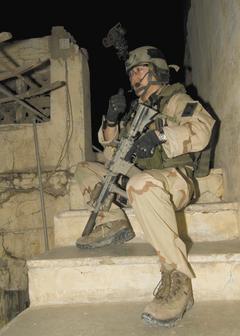 余靖在伊拉克前线的照片,手持M4卡宾枪,头盔上是夜视镜。(台媒图)