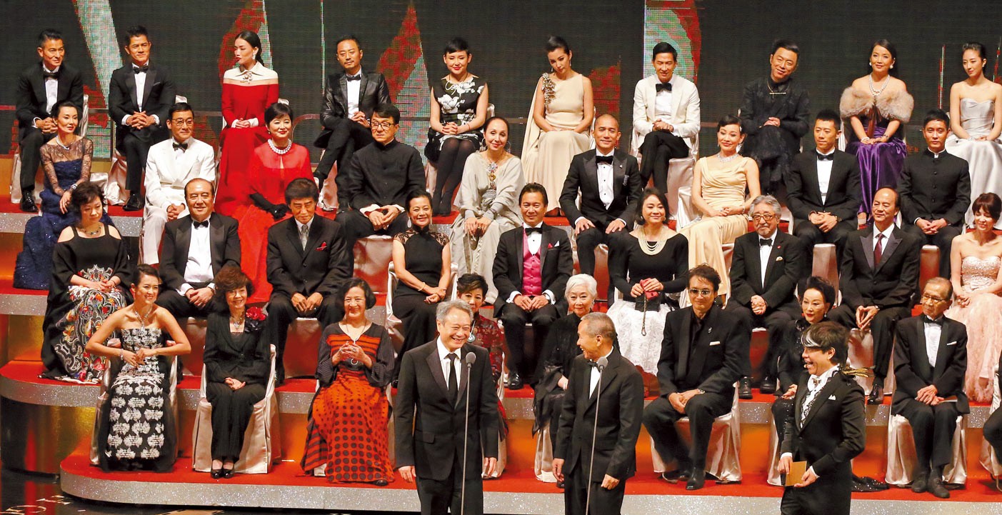 李安(前排左起)、侯孝贤和蔡康永一起和40位历届金马帝后在台上颁最佳影片奖,画面震撼人心。第2排左起依序为章子怡、归亚蕾、江青、凌波、卢燕、秦祥林、徐枫、常枫、李康生。第3排左起依序为陈秋霞、柯俊雄、王冠雄、张艾嘉、艾迪、陆小芬、孙越、狄龙、郑裕玲。第4排左起依序为张曼玉、梁家辉、林青霞、成龙、陈令智、梁朝伟、陈冲、夏雨、谢君豪、秦海璐、杨贵媚。第5排左起依序为 刘德华、郭富城、舒淇、张涵予、刘美君、李冰冰、张家辉、黄渤、吕丽萍、桂纶镁、刘青云。(台媒图)