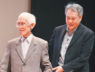 李安(右)与余光中(左)对谈《我与电影》。李安贴心扶着余光中出场。(图片来源:台湾联合新闻网)