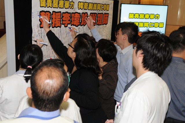 林口长庚发起“谴责医护暴力,用爱声援”联署活动,广告牌都已不够签了。(台媒图)