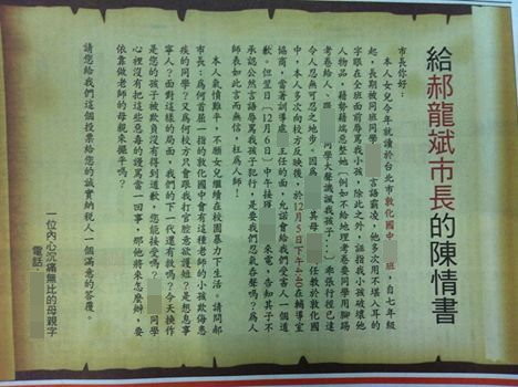 台北市1名家长不满女儿遭霸凌,砸80万元新台币在报纸头版抗议学校处置不公。(来自台媒)