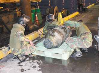 中国台湾网12月13日消息 据台湾《联合报》报道,基隆港为迎接22日即将亮相的黄色小鸭,最近赶工疏浚深内港,昨天傍晚时分,在港内捞出一颗重500磅的炸弹。台军方分析可能是二次大战美军轰炸基隆港的燃烧弹,经检视引信已断。