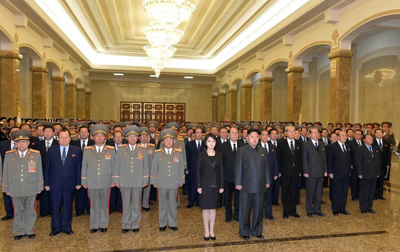 中国台湾网12月18日消息 据台湾媒体报道,17日,在平壤体育馆举行中央追悼大会,纪念前最高领导人金正日逝世两周年。当天,金正恩和夫人李雪主(上图前排左三)及朝鲜党政军领导人到安放金日成、金正日遗体的锦绣山太阳宫拜谒。朝鲜中央通讯社发布照片后,有媒体随即发现,神隐62天的李雪主,消瘦了许多。(中国台湾网 高旭)