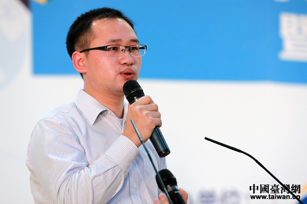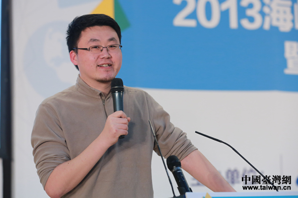 20日下午,由中国台湾网(www.taiwan.cn)、海峡两岸互联网交流委员会、中华台湾MIT正品推广协会主办的“2013海峡两岸学生电子商务大讲堂暨电商大赛颁奖典礼”在京举行。图为北京中关村创新研修学院特聘讲师张远昭作题为“谁不说俺家乡好——家乡特产的微信校园营销”的演讲。(中国台湾网 于斯文 摄)