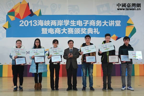 20日下午,由中国台湾网(www.taiwan.cn)、海峡两岸互联网交流委员会、中华台湾MIT正品推广协会主办的“2013海峡两岸学生电子商务大讲堂暨电商大赛颁奖典礼”在京举行。图为中华台湾MIT正品推广协会荣誉理事、瑞可集团总裁涂鄂良与两岸获奖学生代表合影。(中国台湾网 于斯文 摄)