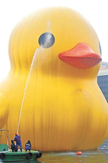 中国台湾网12月26日消息 据台湾《中国时报》报道,大黄鸭到基隆港展出后,被灰尘污垢熏得“黑鸭鸭”,昨(25)日主办单位委由台船及清洁公司执行全球第一次大黄鸭洗澡湿背秀,但强力水柱加上软刷伺候,污垢仍不为所动,黑黑脏脏的痕迹甚至更加扩散。有网友还笑说小鸭长胸毛变身“庞德鸭”,再继续黑下去,就要变姜母鸭了。