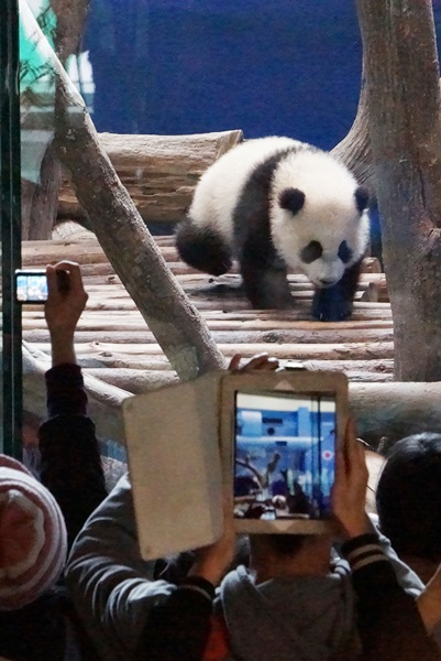 动物园大门在9时开启,正式迎接“圆仔”亮相的历史性一刻。许多游客拔腿狂奔,跑向大猫熊馆。9时10分,“圆仔”正式和大家见面。