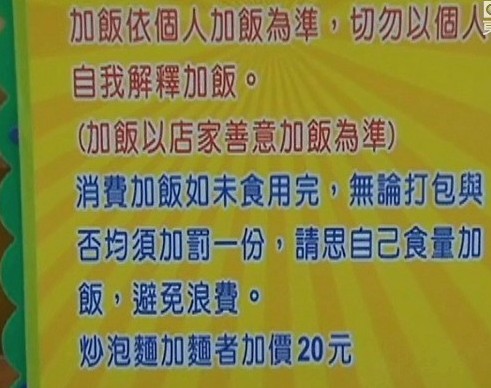 消保官谢清泉指出,“消费之前就已经有告知消费者,我们基于一个节约食材不要浪费,店家这样子的做法也符合比例原则。”消保官也赞同店家的作法,公告明确,做法合理;只能说民众如果吃不完,就不要贪心加饭,不但浪费食物还得多花钱。(中国台湾网 高旭)