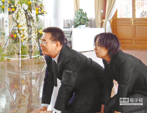 图为林毅夫2002年在北京大学中国经济研究中心设置灵堂,通过网络直播与宜兰老家同步参加父亲的告别式。告别式开始,林毅夫与女儿跪地哀伤地看着屏幕。(图片来源:中时电子报)