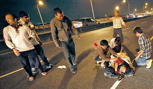 屏东驶往高雄的88快速道路昨日凌晨发生车祸,一名年长妇女被抛摔在大桥上,她的外孙(箭头处)不知所措,路人见状上前帮忙。来自台媒