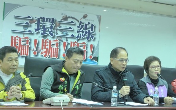 民进党新北市长候选人游锡堃和议会党团追打三环三线,批朱立伦骗骗骗最后什么都看不见。(台媒图)
