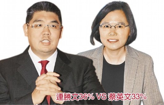 台湾“旺旺中时民调中心”2013年8、9月间的台北市长选情调查显示,国民党连胜文一枝独秀赢得23%认同度,民进党蔡英文气势非凡,也有18%青睐度。当“双文”对决,连胜文有36%支持度,蔡英文也获得33%拥护度,双方实力相当。(图片来源:台湾中时电子报)