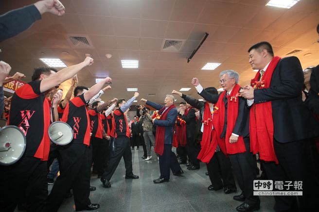 集团主席蔡衍明(中)携各事业主管共同迎接员工进场。(图片来源:台湾《中时电子报》)