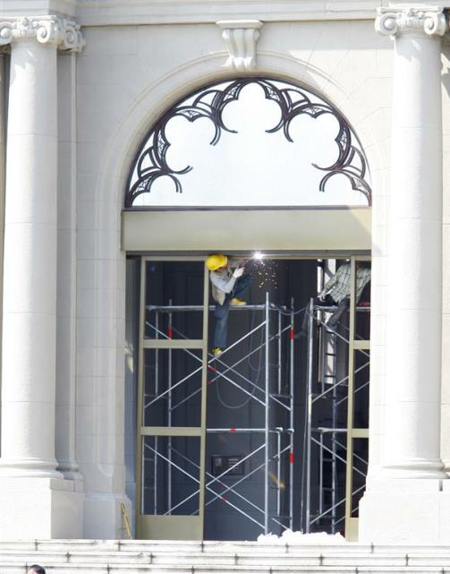 马英九办公室遭撞毁的防弹门,已进行重新安装。(图片来自台媒)