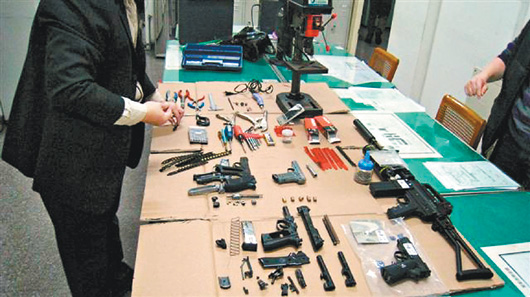 嘉义县中埔警分局查获美国籍补习班教师,持有具杀伤力的改造空气长、短枪各一支,还有大批改造枪械工具。来源:台湾《联合报》