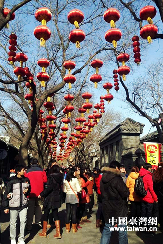 春节期间热闹的南锣鼓巷。(中国台湾网 刘承思 摄)