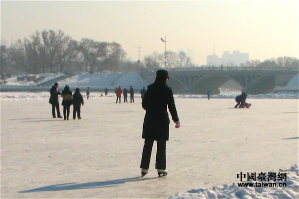 湖面冻结后,形成了天然滑冰场。(中国台湾网 马迪 摄)