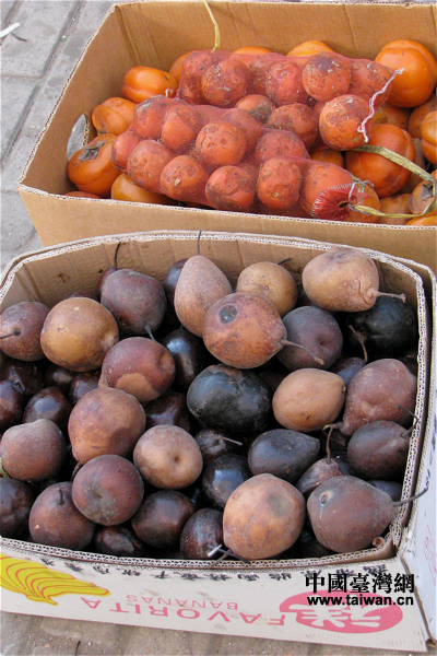 东北人冬天最爱吃的冻柿子、冻梨。(中国台湾网 马迪 摄)
