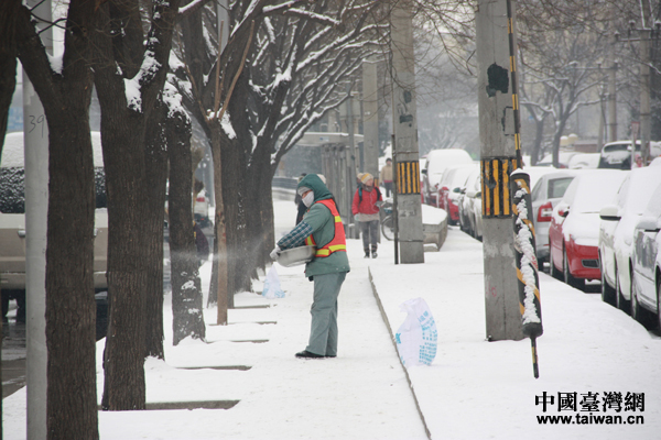 环卫工人在抛洒融雪剂。(中国台湾网 王文英摄)