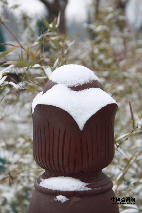 被雪覆盖的栏杆装饰物。(中国台湾网 王文英摄)
