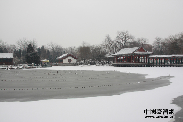 远摄雪中的北京大观园湖泊。(中国台湾网 王文英摄)