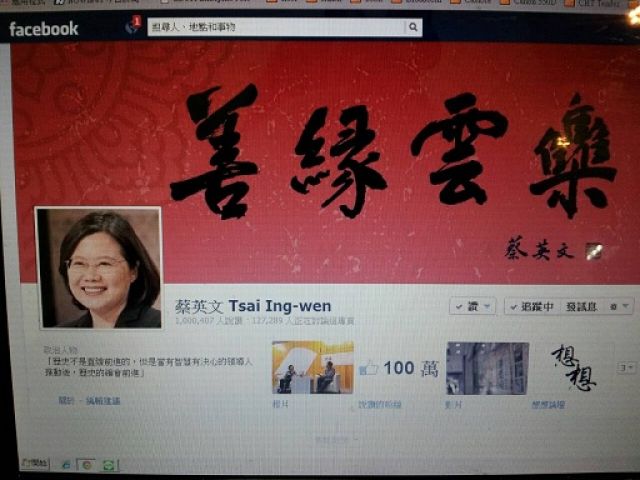 前民进党主席蔡英文脸书粉丝破百万人(台媒翻摄自蔡英文脸书)